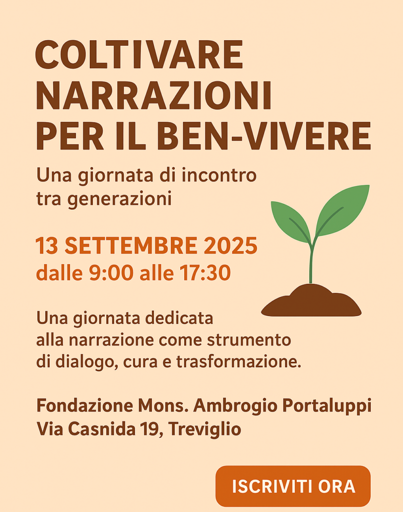 Il potere delle parole e delle storie è capace di creare ponti, aprire nuove prospettive e generare comunità. Con questa convinzione nasce “Coltivare narrazioni per il ben-vivere”, una giornata di formazione e confronto aperta a tutte le generazioni, organizzata presso la Fondazione Mons. Ambrogio Portaluppi (Via Casnida 19, Treviglio) sabato 13 settembre 2025, dalle 9:00 alle 17:30.